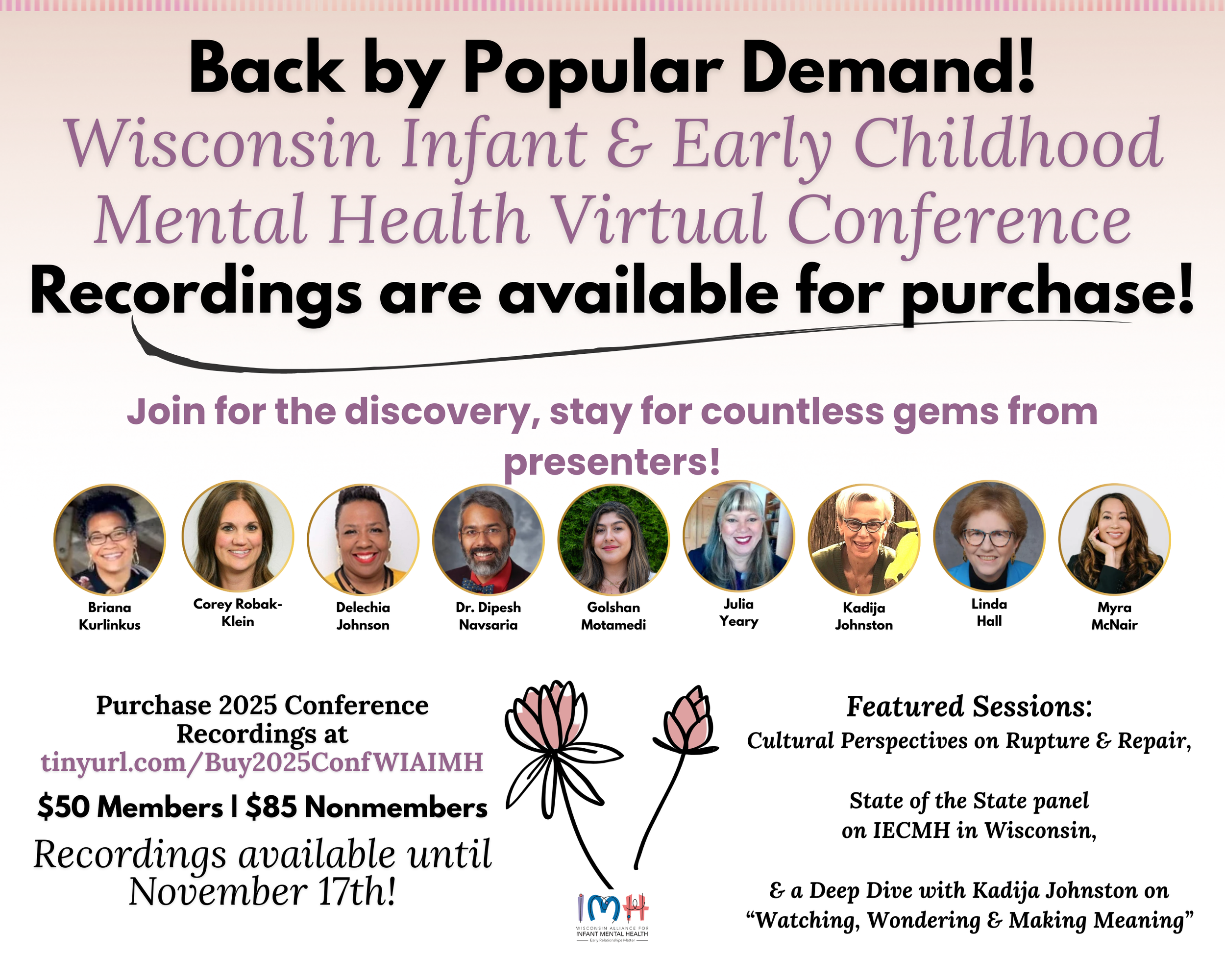 The 2025 Wisconsin Infant & Early Childhood Mental Health Virtual Conference is available for purchase! We’ve had lots of interest in accessing the recordings of our annual conference on October 14, 2025, so we’ve decided to make it available to those who missed the registration deadline or were unable to attend.
